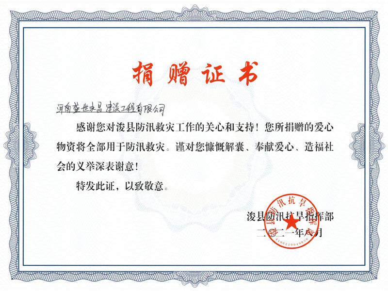 一方有難八方支援,2021年8月1日,我司援助浚縣參與救災捐贈證書。